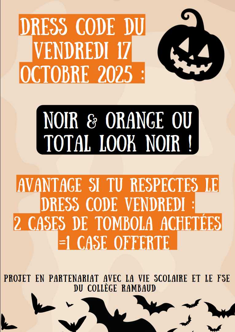 Le vendredi 17 octobre, tous les personnels et usagers du collège sont invités à venir habillés en total look noir, ou en noir et orange. Les élèves respectant le dress code auront un avantage ce jour-là : 2 cases de tombola achetées = 1 offerte !